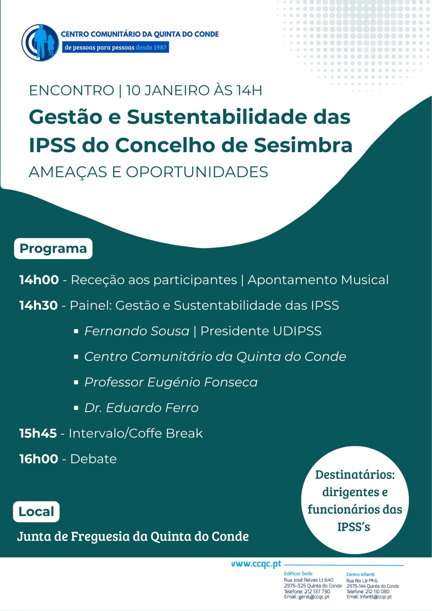 Para começar o ano da melhor forma, o Centro Comunitário da Quinta do Conde promove, no próximo dia 10 de janeiro, às 14h, um encontro dedicado ao tema “Gestão e Sustentabilidade das IPSS do Concelho de Sesimbra – Ameaças e Oportunidades”, que terá lugar na Junta de Freguesia da QuintaVeja Artigo Completo