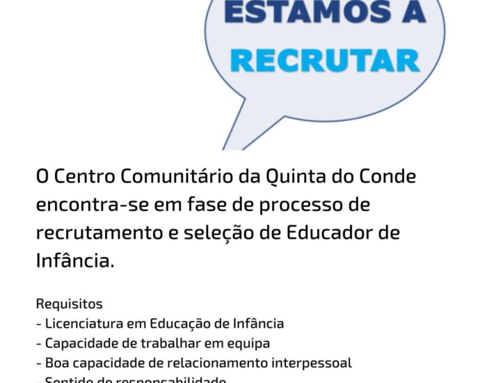 O Centro Comunitário da Quinta do Conde encontra-se em fase de processo de recrutamento e seleção de Educador de Infância.Requisitos– Licenciatura em Educação Pré-Escolar– Capacidade de trabalhar em equipa– Boa capacidade de relacionamento interpessoal– Sentido de responsabilidade– Capacidade de planeamento e organização– Ser dinâmico, criativo, assíduo e pontual– Disponibilidade totalAsVeja Artigo Completo